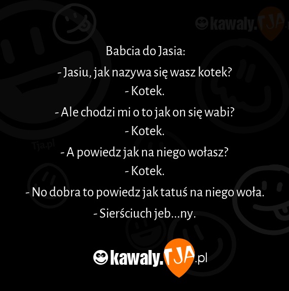 Babcia do Jasia: - Jasiu, jak nazywa się wasz kotek? - Kotek. - Ale chodzi mi o to jak on się wabi? - Kotek. - A powiedz jak na niego wołasz? - Kotek. - No dobra to powiedz jak tatuś na niego woła. - Sierściuch jeb...ny.