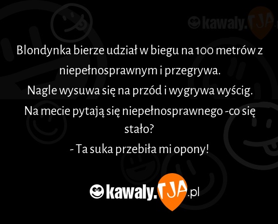 Blondynka bierze udział w biegu na 100 metrów z niepełnosprawnym i przegrywa. Nagle wysuwa się na przód i wygrywa wyścig. Na mecie pytają się niepełnosprawnego -co się stało? - Ta suka przebiła mi opony!