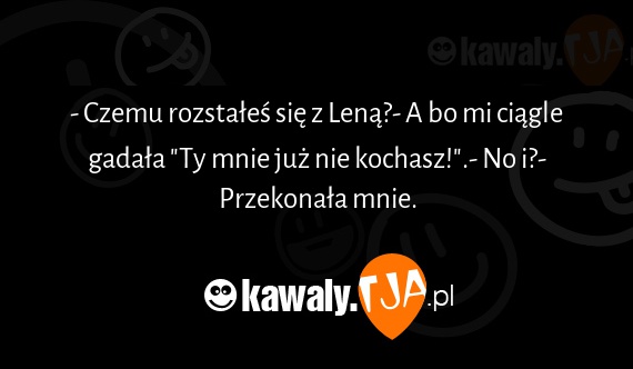 - Czemu rozstałeś się z Leną?- A bo mi ciągle gadała "Ty mnie już nie kochasz!".- No i?- Przekonała mnie.