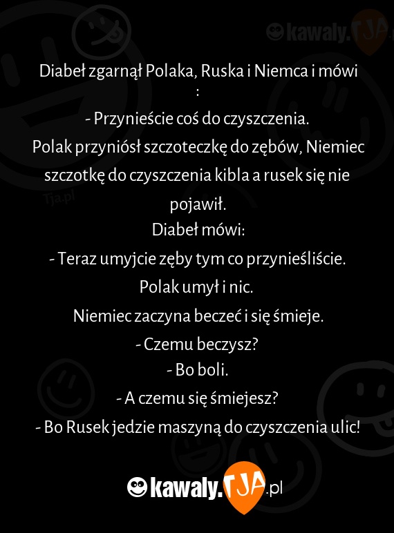 Polak przyniósł szczoteczkę do zębów, Niemiec szczotkę do czyszczenia kibla a rusek się nie pojawił.