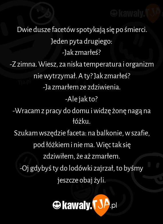 Szukam wszędzie faceta: na balkonie, w szafie, pod łóżkiem i nie ma. Więc tak się zdziwiłem, że aż zmarłem.