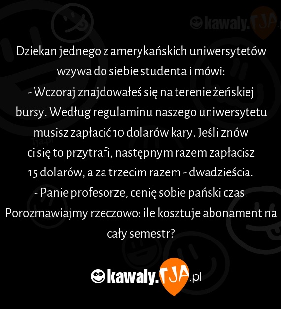- Wczoraj znajdowałeś się na terenie żeńskiej bursy. Według regulaminu naszego uniwersytetu musisz zapłacić 10 dolarów kary. Jeśli znów ci się to przytrafi, następnym razem zapłacisz 15 dolarów, a za trzecim razem - dwadzieścia.