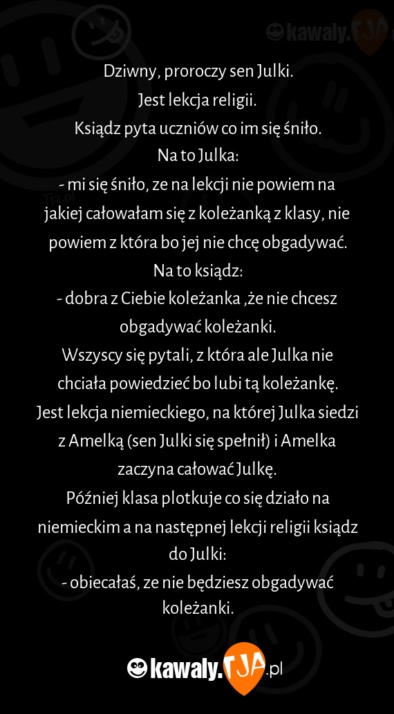 - mi się śniło, ze na lekcji nie powiem na jakiej całowałam się z koleżanką z klasy, nie powiem z która bo jej nie chcę obgadywać.