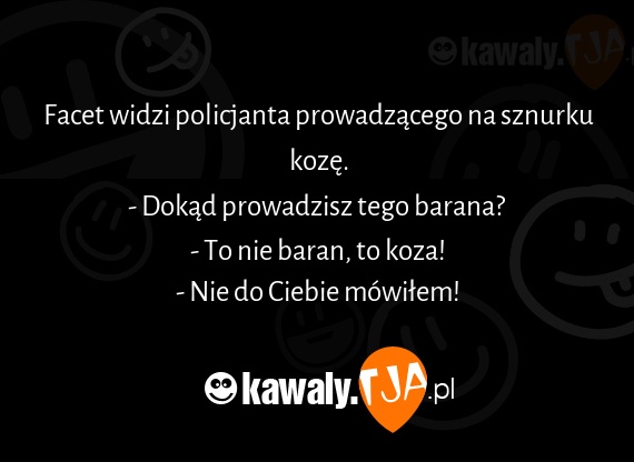 Facet widzi policjanta prowadzącego na sznurku kozę. - Dokąd prowadzisz tego barana? - To nie baran, to koza! - Nie do Ciebie mówiłem!