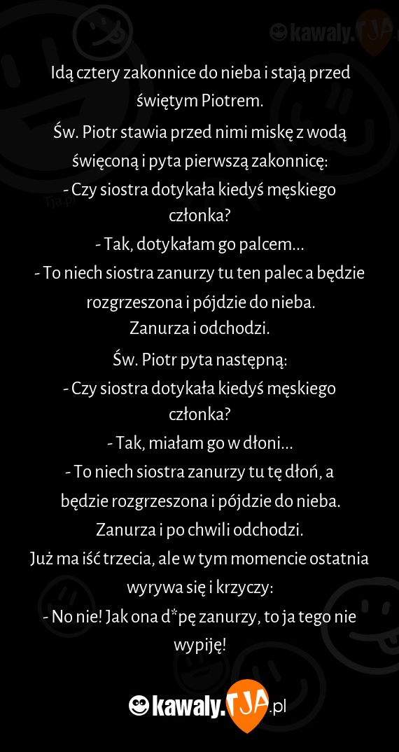 Idą cztery zakonnice do nieba i stają przed świętym Piotrem.
