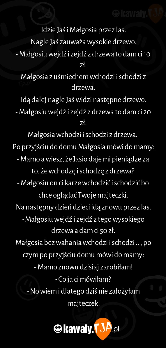 - Mamo a wiesz, że Jasio daje mi pieniądze za to, że wchodzę i schodzę z drzewa?