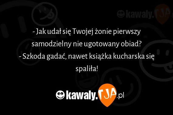 - Jak udał się Twojej żonie pierwszy samodzielny nie ugotowany obiad? - Szkoda gadać, nawet książka kucharska się spaliła!