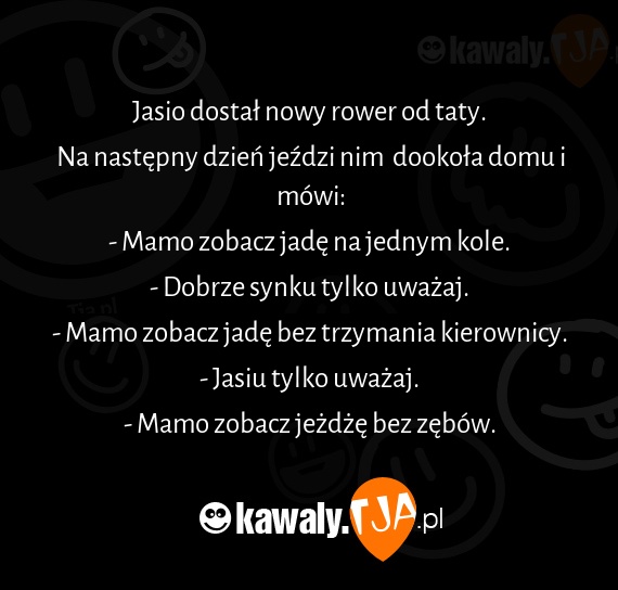 Jasio dostal nowy rower od taty. Na nastepny dzien jexdzi nim dookola domu i mowi: - Mamo zobacz jade na jednym kole. - Dobrze synku tylko uwazaj. - Mamo zobacz jade bez trzymania kierownicy. - Jasiu tylko uwazaj. - Mamo zobacz jezdze bez zebow.