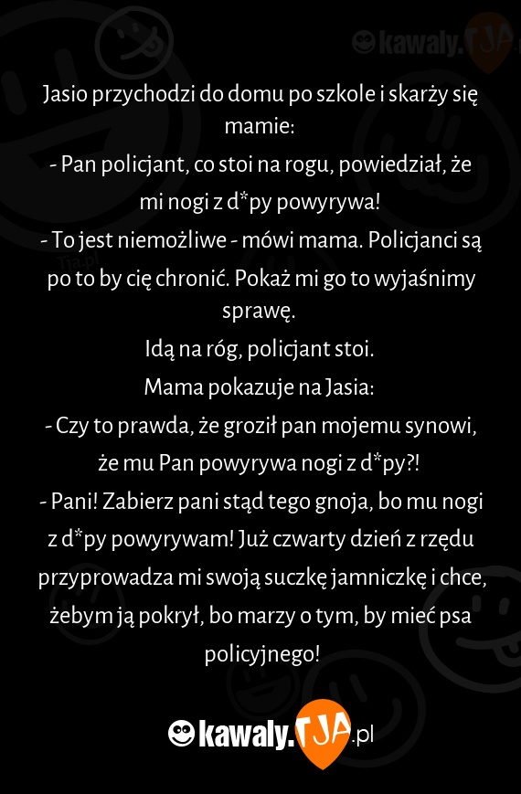 - Pani! Zabierz pani stąd tego gnoja, bo mu nogi z d*py powyrywam! Już czwarty dzień z rzędu przyprowadza mi swoją suczkę jamniczkę i chce, żebym ją pokrył, bo marzy o tym, by mieć psa policyjnego!