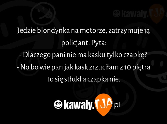 Jedzie blondynka na motorze, zatrzymuje ją policjant. Pyta: - Dlaczego pani nie ma kasku tylko czapkę? - No bo wie pan jak kask zrzuciłam z 10 piętra to się stłukł a czapka nie.