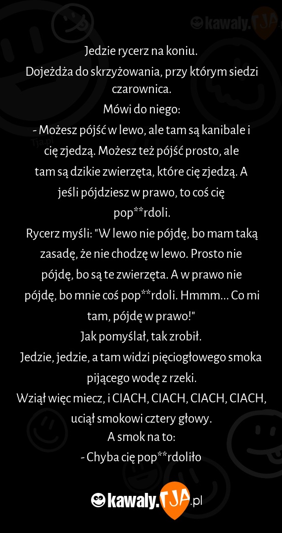 Rycerz myśli: "W lewo nie pójdę, bo mam taką zasadę, że nie chodzę w lewo. Prosto nie pójdę, bo są te zwierzęta. A w prawo nie pójdę, bo mnie coś pop**rdoli. Hmmm... Co mi tam, pójdę w prawo!"