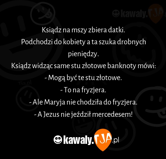 Ksiądz na mszy zbiera datki. Podchodzi do kobiety a ta szuka drobnych pieniędzy. Ksiądz widząc same stu złotowe banknoty mówi: - Mogą być te stu złotowe. - To na fryzjera. - Ale Maryja nie chodziła do fryzjera. - A Jezus nie jeździł mercedesem!