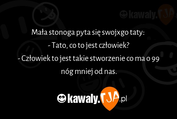 Mala stonoga pyta sie swojxgo taty: - Tato, co to jest czlowiek? - Czlowiek to jest takie stworzenie co ma o 99 nog mniej od nas.