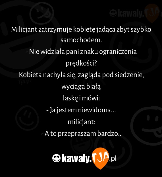 Milicjant zatrzymuje kobietę jadąca zbyt szybko samochodem. - Nie widziała pani znaku ograniczenia prędkości? Kobieta nachyla się, zagląda pod siedzenie, wyciąga białą laskę i mówi: - Ja jestem niewidoma... milicjant: - A to przepraszam bardzo..