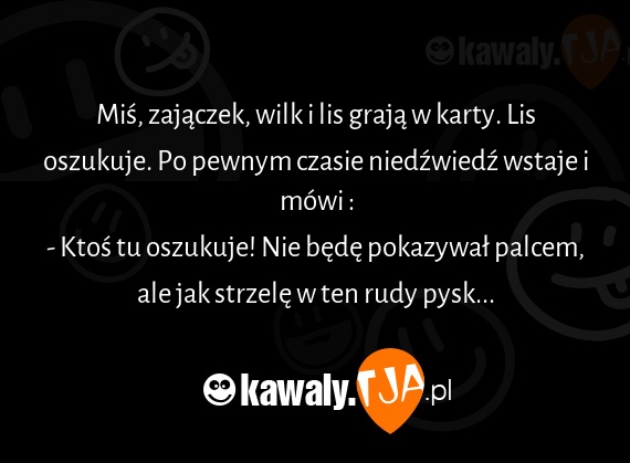 Mis, zajaczek, wilk i lis graja w karty. Lis oszukuje. Po pewnym czasie niedxwiedx wstaje i mowi : - Ktos tu oszukuje! Nie bede pokazywal palcem, ale jak strzele w ten rudy pysk...