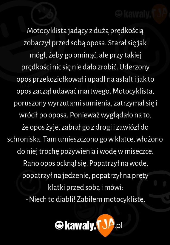 Motocyklista jadący z dużą prędkością zobaczył przed sobą oposa. Starał się jak mógł, żeby go ominąć, ale przy takiej prędkości nic się nie dało zrobić. Uderzony opos przekoziołkował i upadł na asfalt i jak to opos zaczął udawać martwego. Motocyklista, poruszony wyrzutami sumienia, zatrzymał się i wrócił po oposa. Ponieważ wyglądało na to, że opos żyje, zabrał go z drogi i zawiózł do schroniska. Tam umieszczono go w klatce, włożono do niej trochę pożywienia i wodę w miseczce. Rano opos ocknął się. Popatrzył na wodę, popatrzył na jedzenie, popatrzył na pręty klatki przed sobą i mówi: