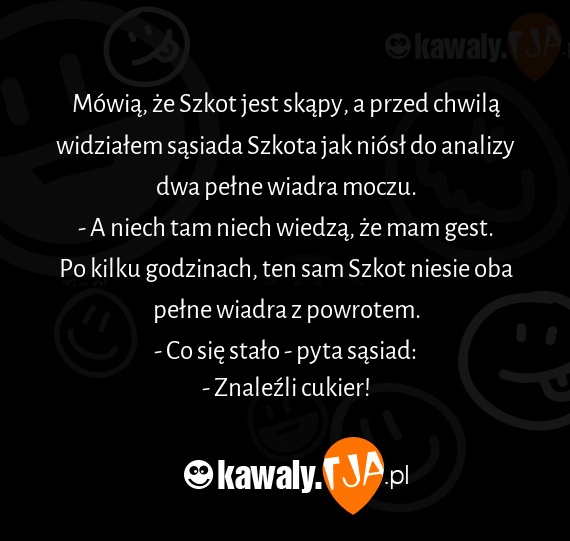 Mówią, że Szkot jest skąpy, a przed chwilą widziałem sąsiada Szkota jak niósł do analizy dwa pełne wiadra moczu.