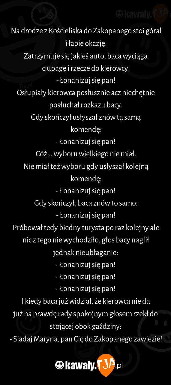 Zatrzymuje się jakieś auto, baca wyciąga ciupagę i rzecze do kierowcy: