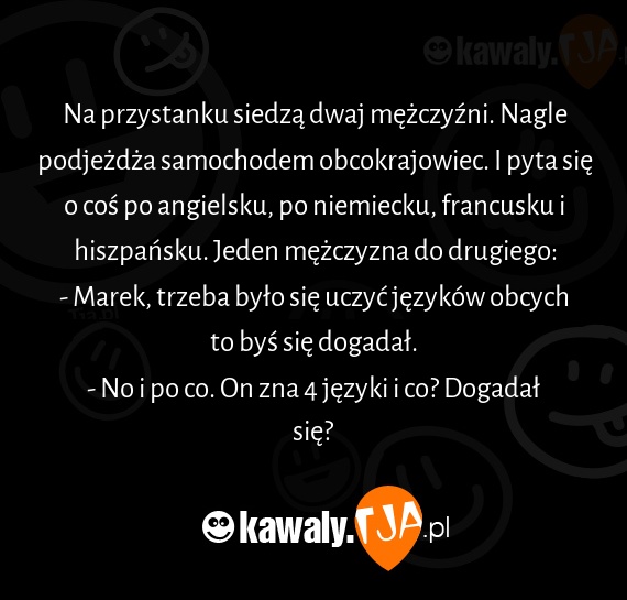 Na przystanku siedzą dwaj mężczyźni. Nagle podjeżdża samochodem obcokrajowiec. I pyta się o coś po angielsku, po niemiecku, francusku i hiszpańsku. Jeden mężczyzna do drugiego: