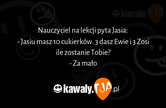 Nauczyciel na lekcji pyta Jasia: - Jasiu masz 10 cukierków. 3 dasz Ewie i 3 Zosi ile zostanie Tobie? - Za mało