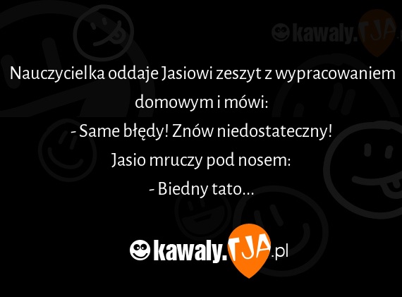 Nauczycielka oddaje Jasiowi zeszyt z wypracowaniem domowym i mówi: - Same błędy! Znów niedostateczny! Jasio mruczy pod nosem: - Biedny tato...