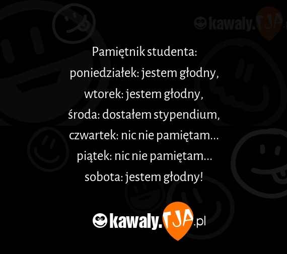 Pamiętnik studenta: poniedziałek: jestem głodny, wtorek: jestem głodny, środa: dostałem stypendium, czwartek: nic nie pamiętam... piątek: nic nie pamiętam... sobota: jestem głodny!
