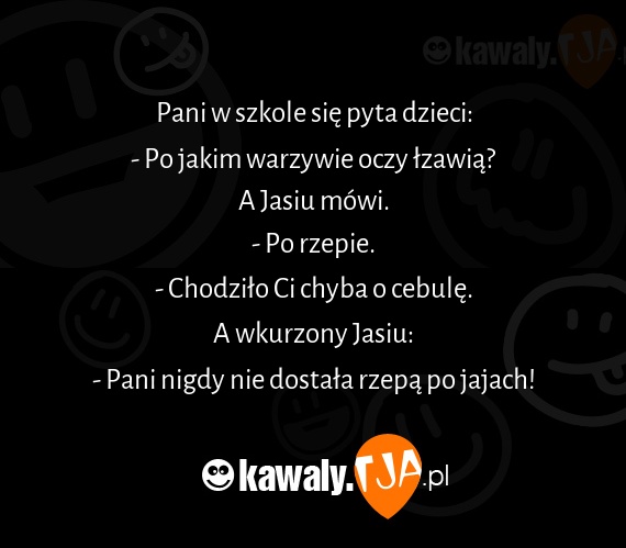 Pani w szkole się pyta dzieci: - Po jakim warzywie oczy łzawią? A Jasiu mówi. - Po rzepie. - Chodziło Ci chyba o cebulę. A wkurzony Jasiu: - Pani nigdy nie dostała rzepą po jajach!