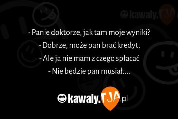 - Panie doktorze, jak tam moje wyniki? - Dobrze, może pan brać kredyt. - Ale ja nie mam z czego spłacać - Nie będzie pan musiał....