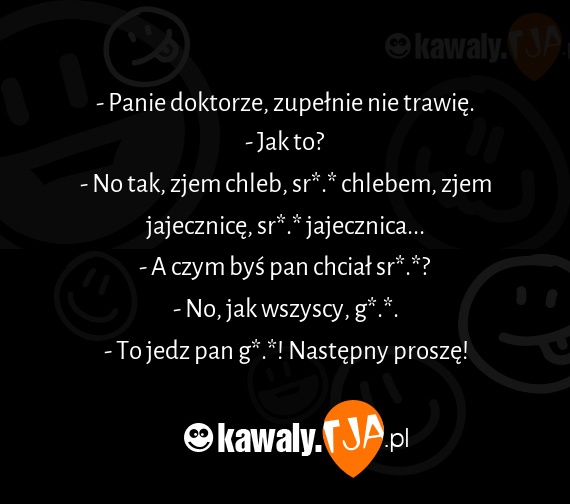 - Panie doktorze, zupełnie nie trawię. - Jak to? - No tak, zjem chleb, sr*.* chlebem, zjem jajecznicę, sr*.* jajecznica... - A czym byś pan chciał sr*.*? - No, jak wszyscy, g*.*. - To jedz pan g*.*! Następny proszę!