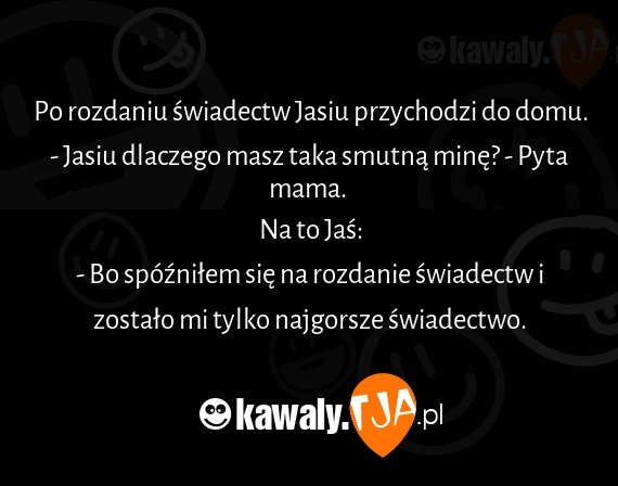 Po rozdaniu swiadectw Jasiu przychodzi do domu. - Jasiu dlaczego masz taka smutna mine? - Pyta mama. Na to Jas: - Bo spoxnilem sie na rozdanie swiadectw i zostalo mi tylko najgorsze swiadectwo.