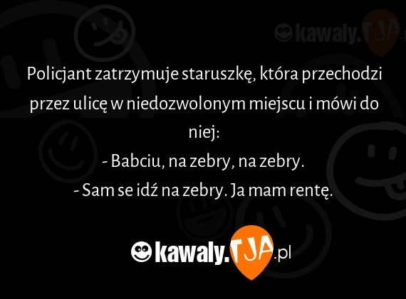 Policjant zatrzymuje staruszke, ktora przechodzi przez ulice w niedozwolonym miejscu i mowi do niej: - Babciu, na zebry, na zebry. - Sam se idx na zebry. Ja mam rente.