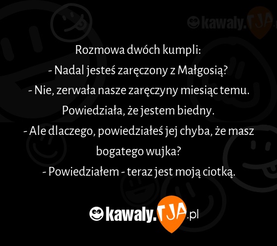 Rozmowa dwóch kumpli: - Nadal jesteś zaręczony z Małgosią? - Nie, zerwała nasze zaręczyny miesiąc temu. Powiedziała, że jestem biedny. - Ale dlaczego, powiedziałeś jej chyba, że masz bogatego wujka? - Powiedziałem - teraz jest moją ciotką.