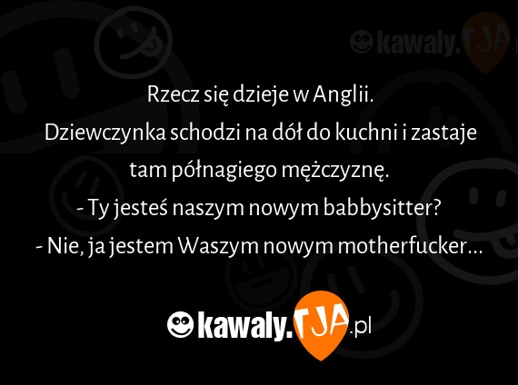 Rzecz się dzieje w Anglii. Dziewczynka schodzi na dół do kuchni i zastaje tam półnagiego mężczyznę. - Ty jesteś naszym nowym babbysitter? - Nie, ja jestem Waszym nowym motherfucker...