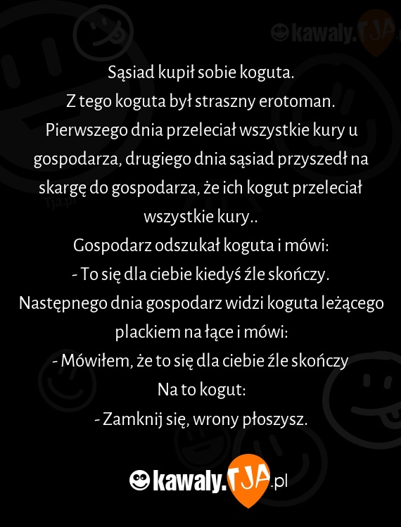 Pierwszego dnia przeleciał wszystkie kury u gospodarza, drugiego dnia sąsiad przyszedł na skargę do gospodarza, że ich kogut przeleciał wszystkie kury..