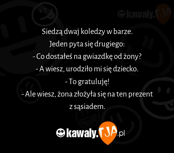 Siedzą dwaj koledzy w barze. Jeden pyta się drugiego: - Co dostałeś na gwiazdkę od żony? - A wiesz, urodziło mi się dziecko. - To gratuluję! - Ale wiesz, żona złożyła się na ten prezent z sąsiadem.