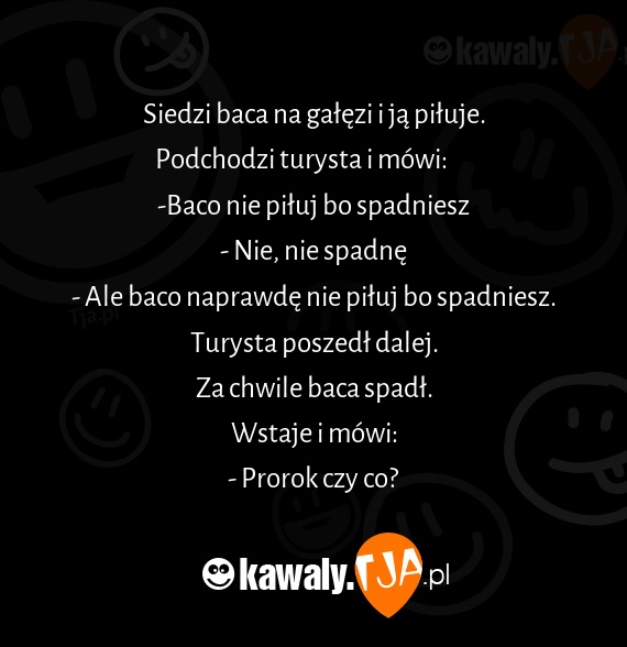 Siedzi baca na galezi i ja piluje. Podchodzi turysta i mowi: -Baco nie piluj bo spadniesz - Nie, nie spadne - Ale baco naprawde nie piluj bo spadniesz. Turysta poszedl dalej. Za chwile baca spadl. Wstaje i mowi: - Prorok czy co?