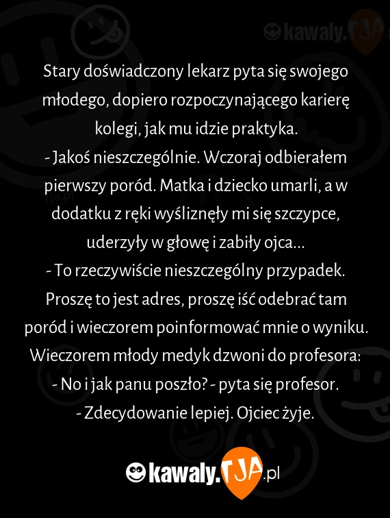 - To rzeczywiście nieszczególny przypadek. Proszę to jest adres, proszę iść odebrać tam poród i wieczorem poinformować mnie o wyniku.
