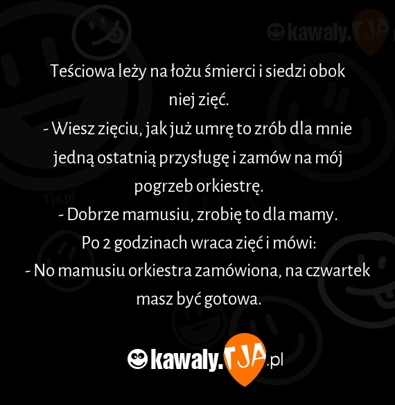 - Wiesz zięciu, jak już umrę to zrób dla mnie jedną ostatnią przysługę i zamów na mój pogrzeb orkiestrę.