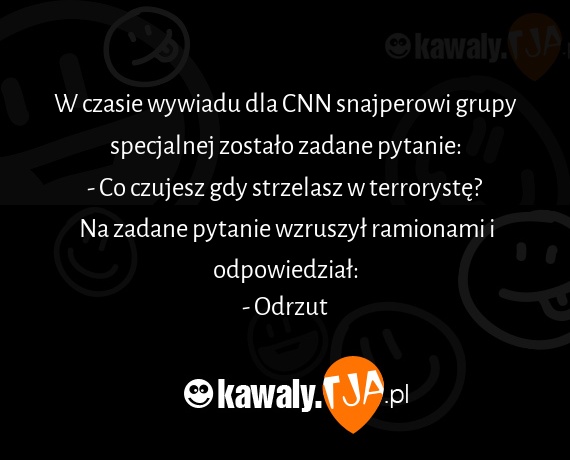 W czasie wywiadu dla CNN snajperowi grupy specjalnej zostalo zadane pytanie: - Co czujesz gdy strzelasz w terroryste? Na zadane pytanie wzruszyl ramionami i odpowiedzial: - Odrzut