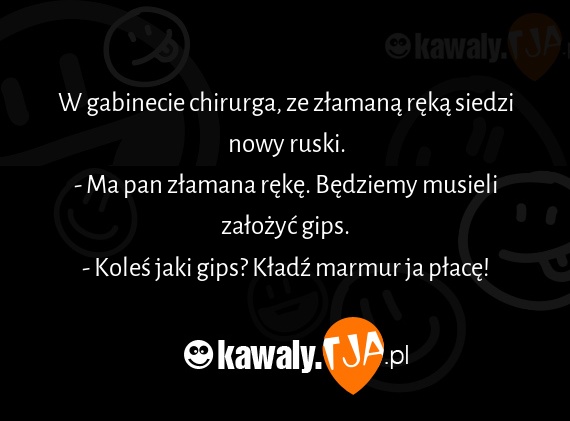 W gabinecie chirurga, ze złamaną ręką siedzi nowy ruski. - Ma pan złamana rękę. Będziemy musieli założyć gips. - Koleś jaki gips? Kładź marmur ja płacę!
