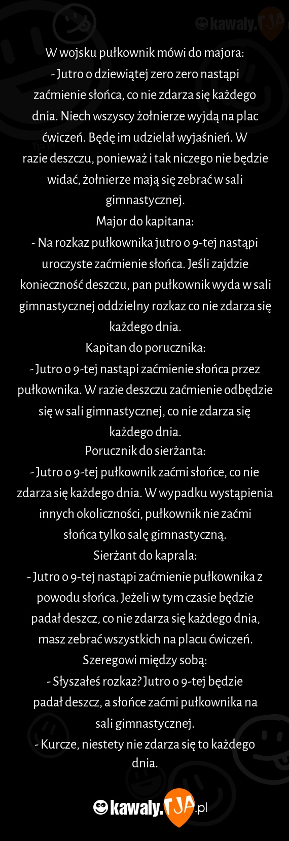 - Na rozkaz pułkownika jutro o 9-tej nastąpi uroczyste zaćmienie słońca. Jeśli zajdzie konieczność deszczu, pan pułkownik wyda w sali gimnastycznej oddzielny rozkaz co nie zdarza się każdego dnia.