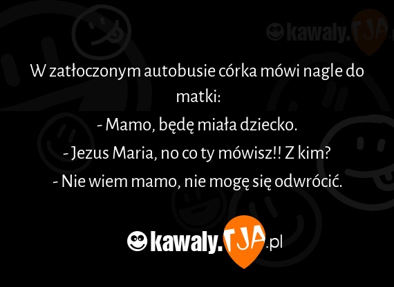 W zatłoczonym autobusie córka mówi nagle do matki: - Mamo, będę miała dziecko. - Jezus Maria, no co ty mówisz!! Z kim? - Nie wiem mamo, nie mogę się odwrócić.