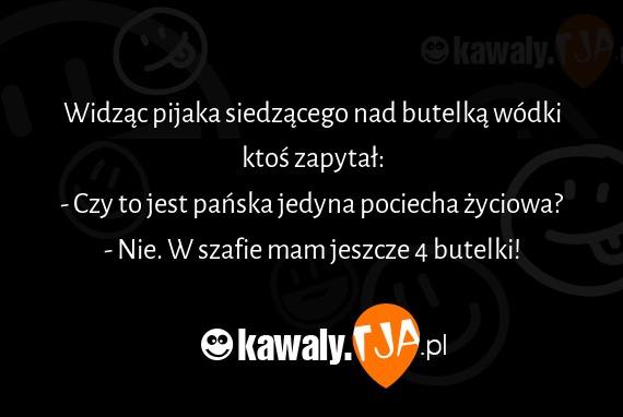 Widząc pijaka siedzącego nad butelką wódki ktoś zapytał: - Czy to jest pańska jedyna pociecha życiowa? - Nie. W szafie mam jeszcze 4 butelki!