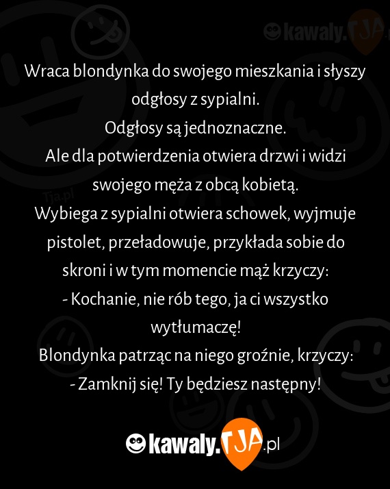 Wraca blondynka do swojego mieszkania i słyszy odgłosy z sypialni.