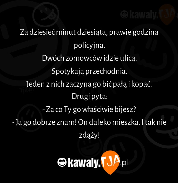 Za dziesiec minut dziesiata, prawie godzina policyjna. Dwoch zomowcow idzie ulica. Spotykaja przechodnia. Jeden z nich zaczyna go bic pala i kopac. Drugi pyta: - Za co Ty go wlasciwie bijesz? - Ja go dobrze znam! On daleko mieszka. I tak nie zdazy!