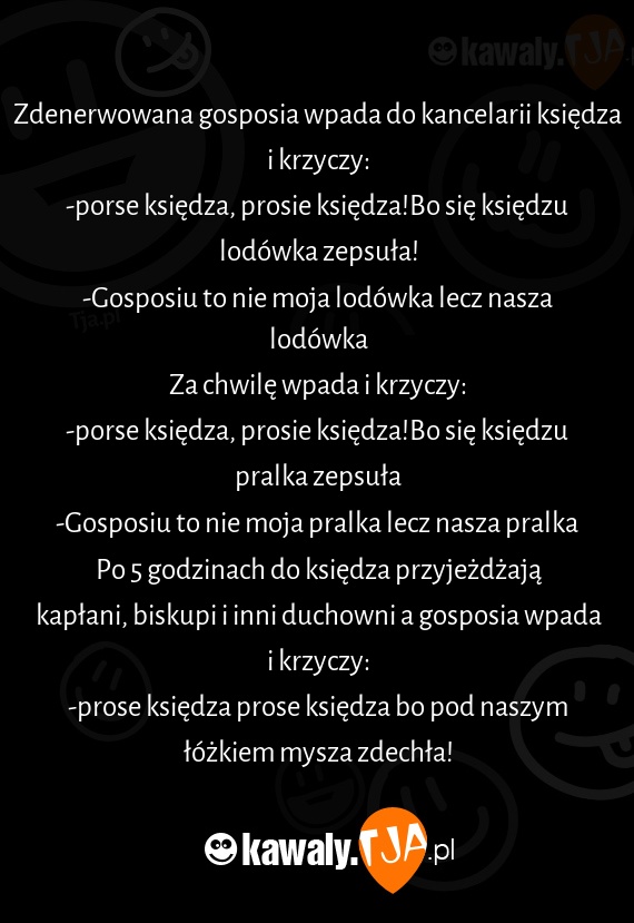 Zdenerwowana gosposia wpada do kancelarii księdza i krzyczy: