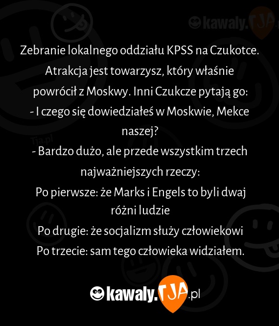 Zebranie lokalnego oddziału KPSS na Czukotce. Atrakcja jest towarzysz, który właśnie powrócił z Moskwy. Inni Czukcze pytają go:
