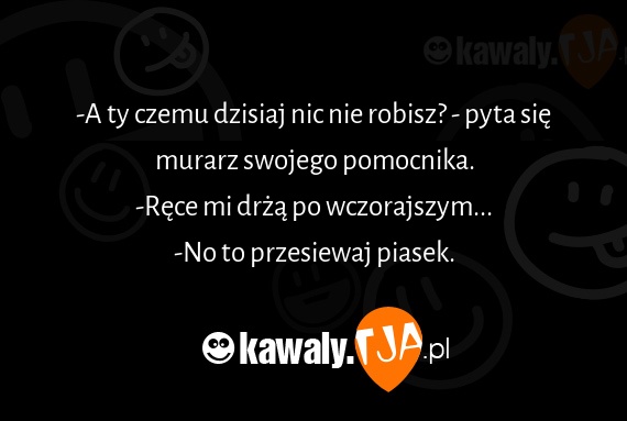 -A ty czemu dzisiaj nic nie robisz? - pyta się murarz swojego pomocnika. -Ręce mi drżą po wczorajszym... -No to przesiewaj piasek.