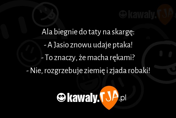 Ala biegnie do taty na skarge: - A Jasio znowu udaje ptaka! - To znaczy, ze macha rekami? - Nie, rozgrzebuje ziemie i zjada robaki!
