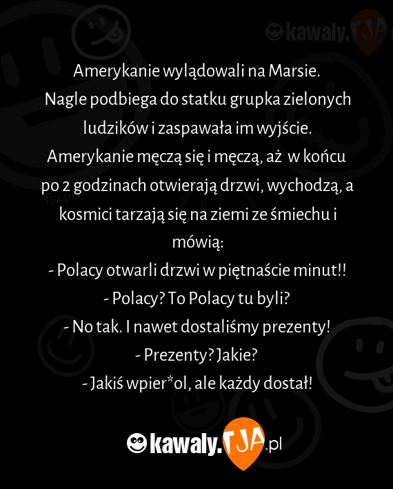 Amerykanie męczą się i męczą, aż w końcu po 2 godzinach otwierają drzwi, wychodzą, a kosmici tarzają się na ziemi ze śmiechu i mówią: